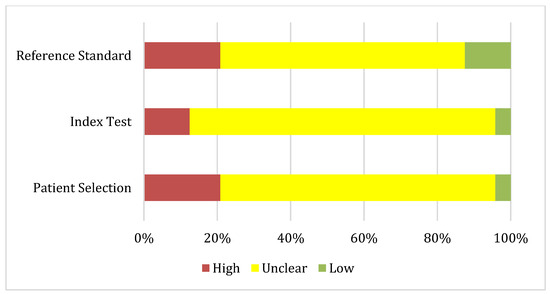 Applicability concerns summary about each QUADAS-AI domain presented as percentages across the 24 included studies.