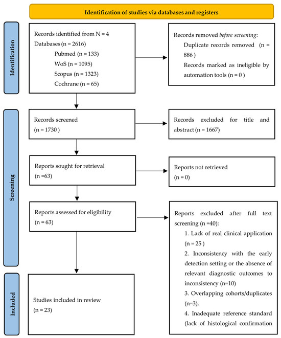 The identification and selection of studies were conducted in accordance with the PRISMA 2020 statement [18]. Database searches yielded a total of 2616 records: 133 from PubMed, 1323 from Scopus, 1095 from Web of Science, and 65 from Cochrane Library. The database screening was carried out by three independent reviewers (RDS, GM, MI) from January 2015 to 18 April 2025 using the following keywords combined with Boolean operators: prostate cancer, AI, MRI, early detection, machine learning, biopsy. Supplementary Materials contains a detailed account of the search strategies applied. After removing 886 duplicates through the Rayyan platform, the 1730 articles were screened by two reviewers for title and abstract. Title and abstract screening resulted in the exclusion of 1667 additional records, and 63 reports were retained for full-text assessment. All of these were successfully retrieved and evaluated for eligibility. Following a thorough evaluation of the 63 full-text articles, 40 were deemed ineligible for specific reasons. The most prevalent cause of exclusion (n = 25) was the lack of real clinical application, as these studies relied exclusively on public datasets (e.g., PROSTATEx) and focused on algorithm development or technical validation without reporting patient-level diagnostic outcomes.