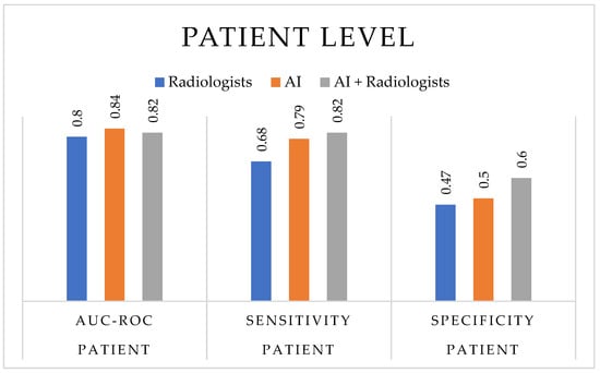 Diagnostic performance at the patient level. The bar chart compares the median values of diagnostic accuracy metrics—AUC-ROC, sensitivity, and specificity—for radiologists, AI-based technologies, and AI-assisted radiologists across the included studies. Median values were selected to better represent the central tendency in heterogeneous datasets and to minimize the influence of outliers.