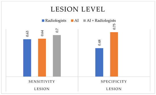 Diagnostic performance at the lesion level. The bar chart compares the median values of sensitivity and specificity for radiologists, AI-based technologies, and AI-assisted radiologists across the included studies. Median values were chosen to provide a more robust representation of central tendency and to account for heterogeneity across lesion-based analyses.