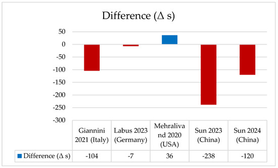 Difference in reporting time (Δ seconds) between radiologists and AI-assisted readings across included studies [26,29,32,36,37]. The chart illustrates the variation in mean reporting time (Δ = AI-assisted − radiologist). Blue bars represent positive differences, and red bars represent negative differences.