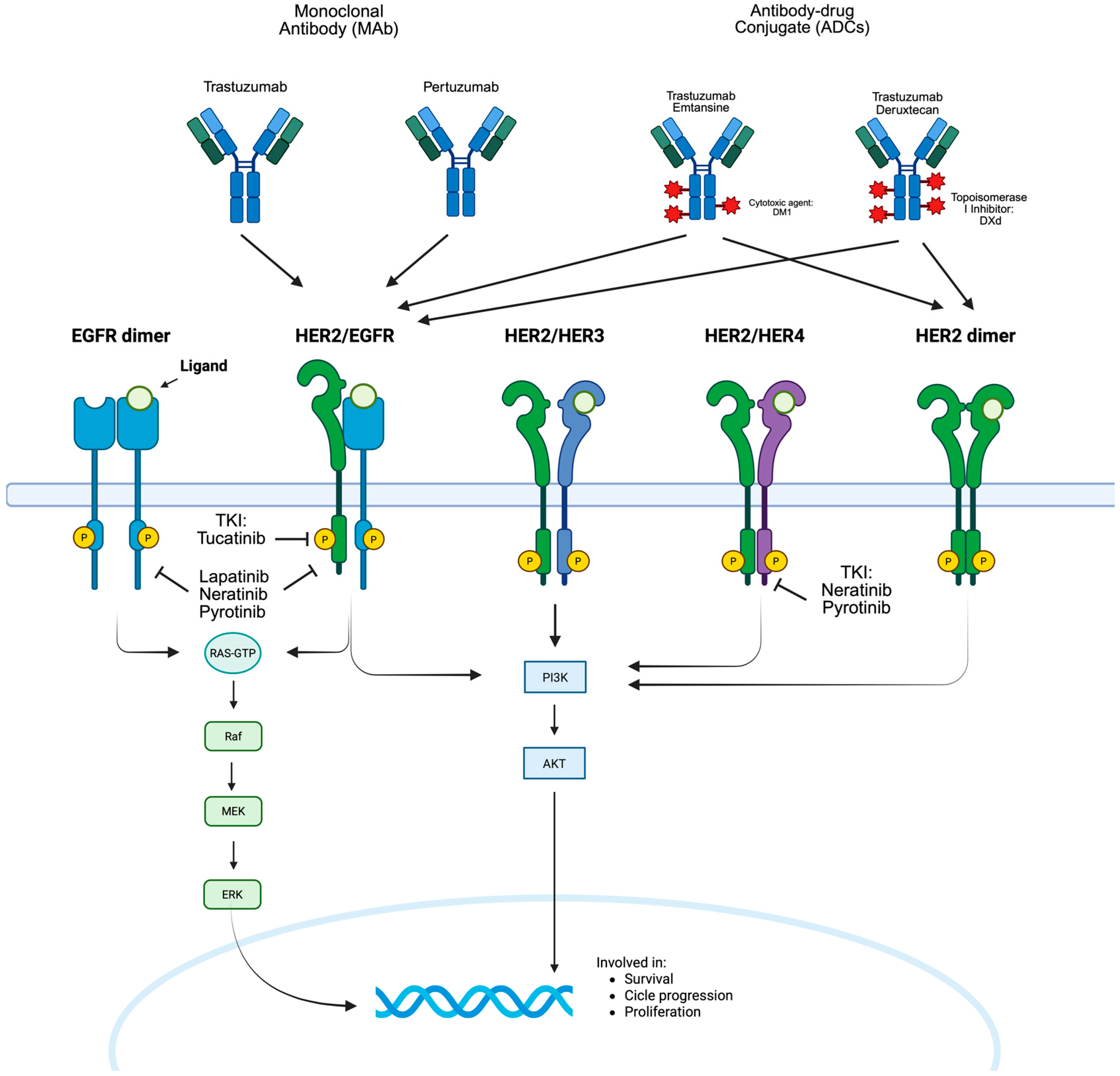 - Zhu, K.; Yang, X.; Tai, H.; Zhong, X.; Luo, T.; Zheng, H. HER2-Targeted Therapies in Cancer: A Systematic Review. Biomark. Res. 2024, 12, 16. [Google Scholar] [CrossRef]