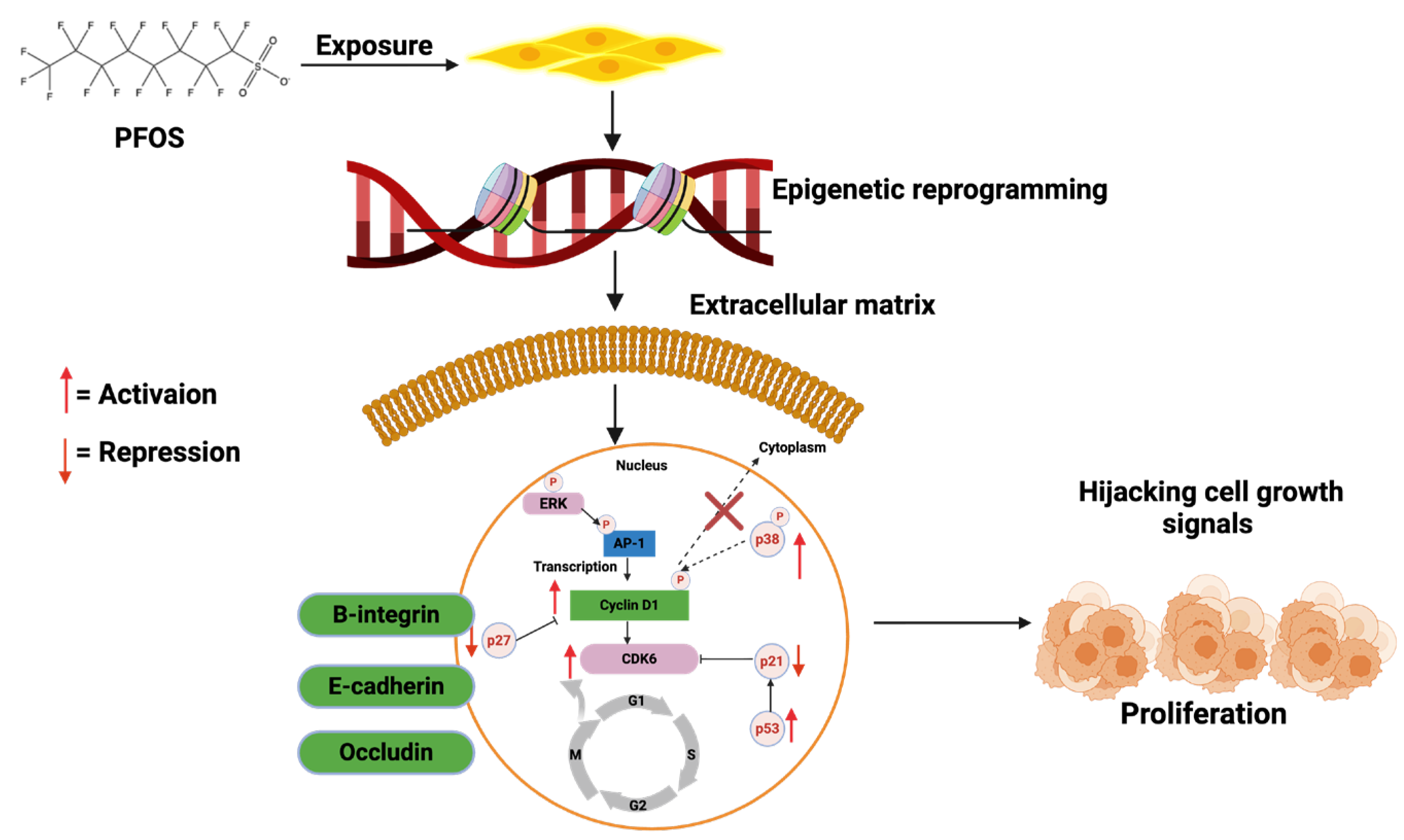 | 7. | MCF-10A | PFOS elevated cyclin D1 and D2 levels, increased the global DNA methylation, as well as reduced the levels of the CDK inhibitor p21, occluding, E-cadherin and β-integrins. | Pierozan et al. [254] |