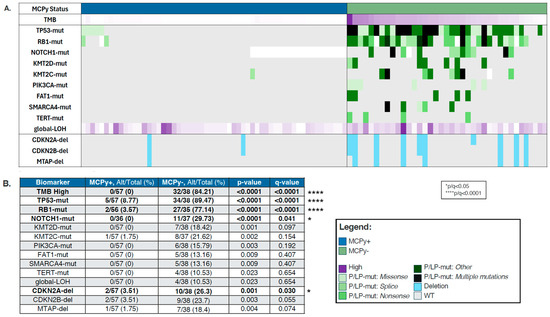 VP and VN-MCC samples were analyzed for mutational differences involved in oncogenesis, with findings depicted in an OncoPrint (Figure 1A). VN-MCC was more frequently found to be TMB high (84.21% vs. 0%, p-value 0) with median TMB 27.5 Muts/Mb (range 2–98) (Table 1). In line with the high TMB, VN-MCC had a significantly higher prevalence of mutations in TP53 (89.47% vs. 8.77%, q ≤ 0.0001), RB1 (77.14% vs. 3.57%, q ≤ 0.0001), and NOTCH1 (29.73% vs. 0%, q = 0.041), with a trend towards higher prevalence of mutations in KMTD2 (18.42% vs. 0%, p = 0.001, q = 0.097), KMT2C (21.62% vs. 1.75%, p = 0.002, q = 0.154), PIK3CA (15.79% vs. 0%, p = 0.003, q = 0.192), FAT1 (13.16% vs. 0%, p = 0.009, q = 0.407), SMARCA4 (13.16% vs. 0%, p = 0.009, q = 0.407), TERT (10.53% vs. 0%, p = 0.023, q = 0.654), and also in global loss of heterozygosity (gLOH) (10.53% vs. 0%, p = 0.023, q = 0.654) (Figure 1B). CDKN2A-del were significantly more prevalent in MCPy− tumors compared to MCPy+ tumors (26.3% vs. 3.51%, q = 0.030) with similar patterns in CDKN2B-del (23.7% vs. 3.51%, q = 0.055) and MTAP-del (18.4% vs. 1.75%). We did not see any significant differences in copy number amplification, PD-L1 positivity by IHC, or dMMR/MSI-H between VP and VN-MCC.