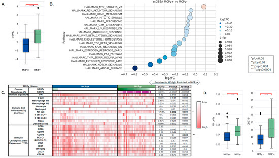 Transcriptomic and tumor immune microenvironment differences were identified between VP and VN-MCC tumors. MAPK Activity Scores (MPAS) were higher in VN-MCC compared to VP-MCC (−0.66 vs. 1.47, q = 0.0001) (Figure 2A). Single-sample gene set enrichment analysis (ssGSEA) of the Hallmarks of Cancer pathways showed enrichment of MYC targets in VP-MCC compared to VN-MCC (NES: 1.06, q = 0.003), while VP-MCC had down-regulation of other pathways such as PI3K/AKT/MTOR Signaling, Heme Metabolism, Mitotic Spindle, Peroxisome, G2M Checkpoint, UV Response Down, Androgen Response, WNT/Beta-Catenin Signaling, Cholesterol Homeostasis, TGF-Beta Signaling, KRAS Signaling Down, Estrogen Response Early, P53 Pathway, TNFA Signaling via NFKB, Estrogen Response Late, NOTCH Signaling, and Apical Surface (NES: 0.66–0.97, q < 0.05) (Figure 2B). COSMIC Mutational Signatures showed a significant difference between VP-MCC and VN-MCC in two UV signatures: SBS7a (0% vs. 24.6%, p ≤ 0.0001) and SBS7b (0% vs. 66.9, p ≤ 0.0001), aligning with TMB findings. Immune cell deconvolution by quanTIseq of bulk RNA expression showed enrichment of NK cells in VN-MCC compared to VP-MCC (3.46% vs. 4.59%, q = 0.021) (Figure 2C,D). No significant differences were noted in other immune cell fractions nor in the IFN response signature. No significant differences were noted in immune checkpoint gene expression except for CD276, where expression was lower in VP-MCC compared to VN-MCC (0.5-FC, q = 0.002) (Figure 2C,D).