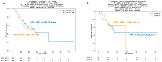 Despite key differences in mutation profiles, immune signatures, and gene expression pertinent to immune checkpoints, no statistically significant difference was identified between real-world overall survival (rwOS) and post-pembrolizumab overall survival (OS) between VP and VN-MCC tumors. Median rwOS for 57 patients with VP-MCC tumors was 25.7 months versus 19.7 months in 38 VN-MCC patients (HR 95% CI: 0.817 (0.457–1.46), p = 0.495) (Figure 3A). In 38 patients with known viral status and available data regarding ICI treatment with pembrolizumab, median real-world rwOS was 16.8 months in 24 VP-MCC patients and not reached in 14 VN-MCC patients, HR 1.25 (95% CI 0.469–3.336, p-value 0.655) (Figure 3B).