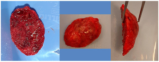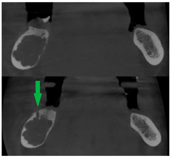 Computer tomography evaluation was performed using RadiAnt DICOM Viewer (Medixant. RadiAnt DICOM Viewer [Software]. version 2024.1 URL: www.radiantviewer.com; accessed on 1 July 2025). A lack of further response to the injections (as evident on the CT scans) was interpreted as a lack of CGCG calcification progression, indicating the need to qualify the patient for a procedure to remove the residual focus (or foci). The procedure consisted of curettage of the residual focus (utilizing bone curettes with sharp tips), chemical radicalization with modified Carnoy’s solution (composition: absolute alcohol 6 mL, chloroform 3 mL, glacial acetic acid 1 mL, ferric chloride 1 g) [4,16,17,18,19] is more secure and more conservative than a typical–classical surgical tumor removal. A seton was introduced into the cavity after the removal of the residual lesion, and it was soaked with Carnoy’s solution, which was left in the cavity for 3 min while the surrounding soft tissues were protected [Figure 4 and Figure 5]. After thoroughly irrigating the bone cavity with saline solution, the bone defect was reconstructed using an autogenous bone graft (chips harvested from the mandible or bone from the anterior iliac crest) mixed with platelet-rich fibrin (PRF).