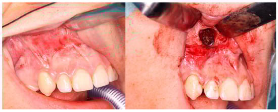 Intraoperative images. (Left): Patient prior to removal of the residual lesion in the anterior region of the right maxilla. (Right): Mucoperiosteal flap elevated, lesion curetted. A gauze seton soaked in Carnoy’s solution is placed in the bone defect (brown discoloration visible due to the fixing effect).