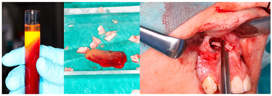 Same patient as shown in Figure 4. Peripheral venous blood was collected and centrifuged to obtain platelet-rich fibrin (PRF). Autogenous bone was mixed with PRF and placed into the defect following lesion removal.