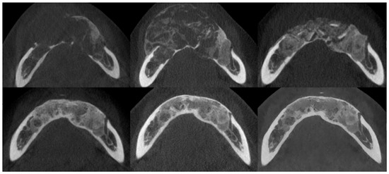 The same patient as shown in Figure 6. CBCT axial sections, from top to bottom and left to right: prior to injections, after injections, postoperative after residual lesion removal, 1-year follow-up, 2-year follow-up, and 3-year follow-up.
