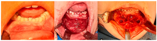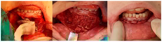 The same patient as shown in Figure 6 and Figure 7. Intraoperative photographs, from left to right: Before tissue incision; after elevation of the mucoperiosteal flap—showing expansion of the mandibular bone with a rebuilt cortical layer; after removal of the residual lesion, with visible bony septa.