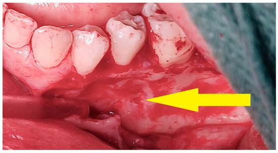 Intraoperative view—surgical removal of a residual lesion. After elevation of the mucoperiosteal flap, a bony depression is visible at the site of multiple intralesional injections (yellow arrow).