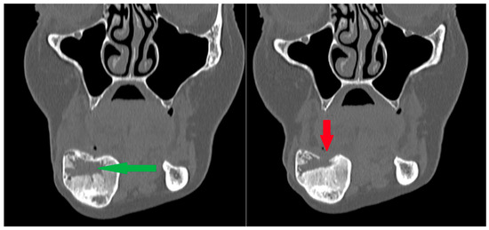 Patient following removal of a residual lesion and reconstruction of an extensive defect with a bone graft. (Left): The green arrow indicates the center of the defect during the healing process after grafting, with visible bone remodeling; the outer cortical layers remain preserved. (Right): Subsequent follow-up radiograph showing arrested healing and cortical bone destruction (red arrow). Recurrence was suspected and later confirmed by surgical excision of the lesion. Note: a second radiolucency is located near the lower border of the mandibular body—it spontaneously calcified during the follow-up period.