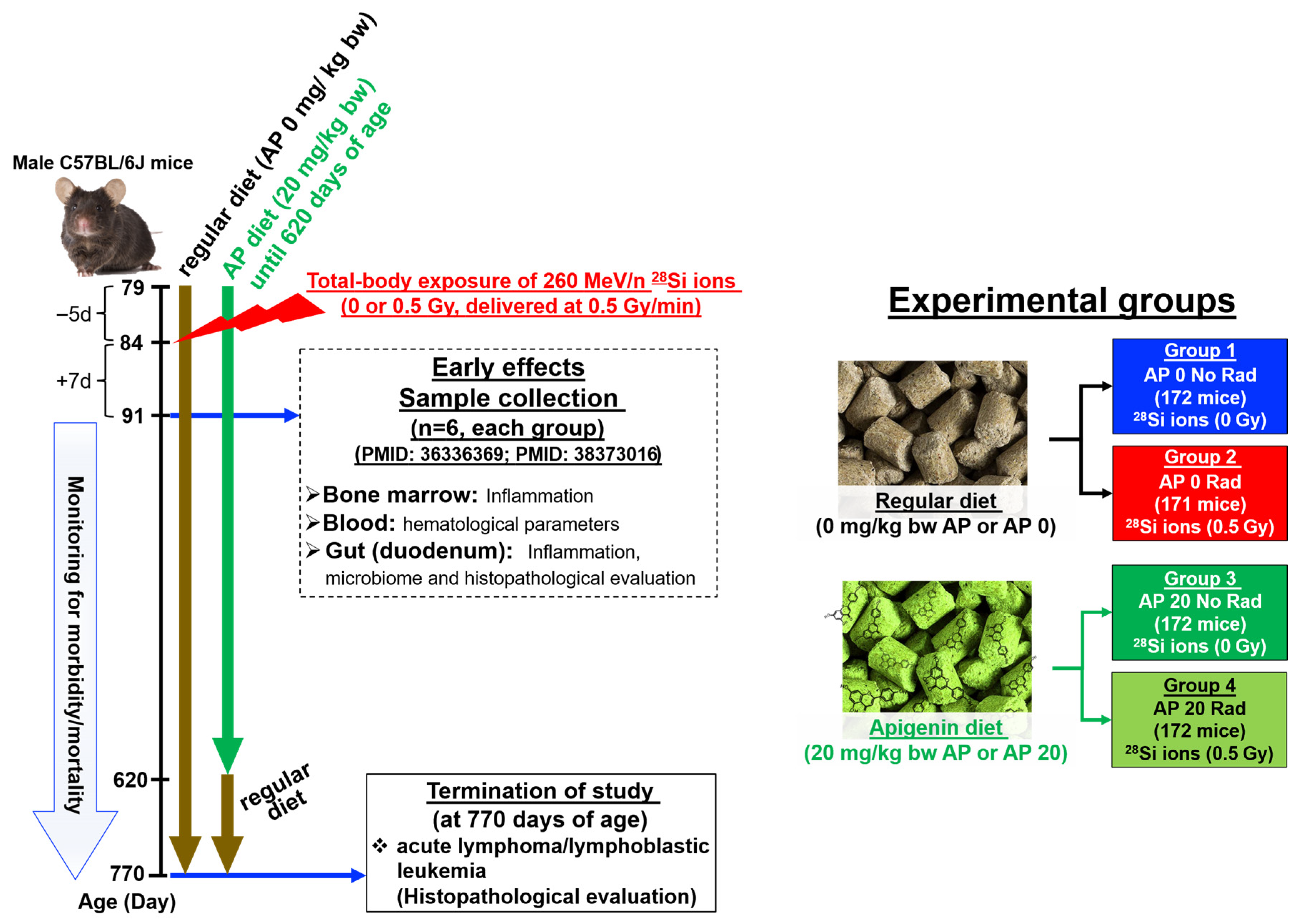 Peanlikhit, T.; Liu, J.; Ahmed, T.; Welsh, J.S.; Karakach, T.; Shroyer, K.R.; Whorton, E., Jr.; Rithidech, K.N. Daily Consumption of Apigenin Prevents Acute Lymphoma/Lymphoblastic Leukemia in Male C57BL/6J Mice Exposed to Space-like Radiation. Cancers 2025, 17, 3513. https://doi.org/10.3390/cancers17213513