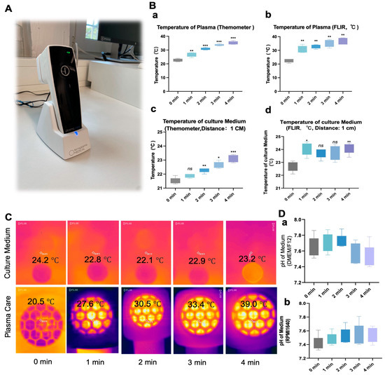 Temperature and pH in the cell culture medium remain stable after NIPP exposure. (A): The Plasma Care device; (B): Measurement of Plasma Care device temperature using both a thermometer (a) and FLIR infrared camera (b); Measurement of the cell culture medium temperature after Plasma Care treatment (1 min, 2 min, 3 min, 4 min) using a thermometer (c) and FLIR infrared camera (d); (C): FLIR infrared camera images of the cell culture medium and Plasma Care after treatment at various time intervals. (D): Temperature readings of the cell culture medium (a,b) after treatment with Plasma Care (1 min, 2 min, 3 min, 4 min); Each experiment was conducted at least three times. Each experimental group was compared to the control group. ***: p < 0.001, **: p < 0.01, *: p < 0.05.
