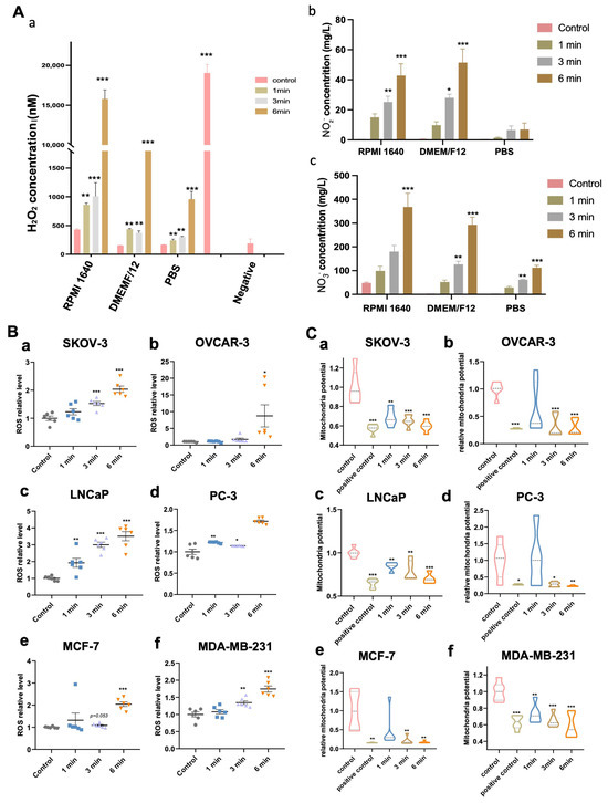 NIPP-induced alterations in extracellular H2O2 levels, intracellular ROS production, and MMP in tumor cells. (A): H2O2 level in the cell culture medium RPMI 1640 and DMEM/F12, and PBS after treatment with NIPP (a); NO2− level in the cell culture medium RPMI 1640 and DMEM/F12, and PBS after treatment with NIPP (b); NO3− level in the cell culture medium RPMI 1640 and DMEM/F12, and PBS after treatment with NIPP (c). (B): ROS level inside the tumor cells SKOV-3 (a), OVCAR-3 (b), LNCaP (c), PC-3 (d), MCF-7 (e), MDA-MB-231 (f) cells, after treatment with the NIPP in 30 min (n = 6). All data are normalized to the control group; (C): Mitochondria membrane potential relative level in the medium of SKOV-3 (a), OVCAR-3 (b), LNCaP (c), PC-3 (d), MCF-7 (e), MDA-MB-231 (f) cells after the exposure of NIPP 24 h, 48 h, and 72 h. Every experiment was replicated at least 3 times. All data are normalized to the control group. *** p < 0.001, **: p < 0.01, *: p < 0.05.