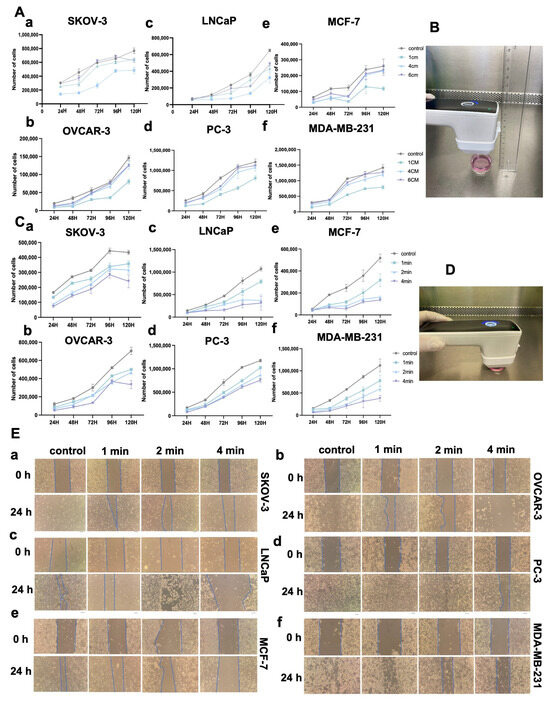 To assess the impact of NIPP on tumor cells, we treated SKOV-3, OVCAR-3, LNCaP, PC-3, MCF-7, and MDA-MB-231 cell lines using a NIPP device Plasma Care (Terraplasma Medical, Garching bei München, Germany). The distance between the NIPP device and the surface of the cell culture medium was set at 1 cm, 4 cm, and 6 cm. As shown in Figure 3A,B, all experimental groups were exposed to NIPP for 4 min, except for the untreated control group. Notably, as the distance between the NIPP device and the culture medium increased, the inhibitory effect of NIPP on tumor cell proliferation progressively diminished. As illustrated in Figure 3C,D, NIPP generally exhibited an inhibitory effect on tumor cell proliferation, and this effect became more pronounced with longer treatment duration.