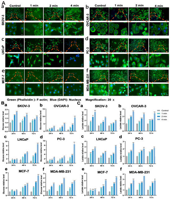 To investigate the impact of NIPP on tumor cell migration, we performed a wound-healing assay. As shown in Figure 3E, compared with the control group, the migration distance of tumor cells was significantly reduced, particularly in the group treated with NIPP for 4 min. These results demonstrate that NIPP exerts a time-dependent inhibitory effect on tumor cell motility. Furthermore, after 24 h of NIPP exposure, we observed a marked reduction in cell proliferation and viability. Many cells exhibited floating and clumping behavior, especially in the 4 min treatment group. To assess morphological and cytoskeletal changes, we performed immunofluorescence staining to examine the expression and localization of F-actin. As shown in Figure 4A, immunofluorescence analysis 24 h post-NIPP treatment revealed clear cytoskeletal disorganization compared to untreated cells. This effect was particularly evident in OVCAR-3 cells (Figure 4A(b)). where F-actin staining, which was concentrated along the cell membrane in the control group, became increasingly disordered with longer treatment durations. In LNCaP cells, F-actin staining was barely detectable in the 4 min treatment group, and cell morphology was no longer clearly visible (Figure 4A(c)). In PC-3 cells, the average cell diameter appeared to increase following NIPP exposure (Figure 4A(d)). In MCF-7 cells, similar to LNCaP, cytoskeletal staining was nearly absent and cell morphology was indistinct in the 4 min treatment group (Figure 4A(e)). In contrast, MDA-MB-231 cells exhibited less pronounced cytoskeletal alterations compared to the other cell lines (Figure 4A(f)). In summary, NIPP significantly disrupts the cytoskeletal structure of tumor cells, which plays a crucial role in cell motility, migration, and the maintenance of normal cellular morphology.