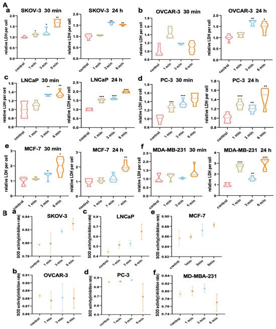 NIPP increases LDH release in tumor cell cultures and induced no significante alterations of SOD levels in tumor cell. (A): LDH relative level in the medium of SKOV-3 (a), OVCAR-3 (b), LNCaP (c), PC-3 (d), MCF-7 (e), and MDA-MB-231 (f) cells after the exposure to NIPP for 30 min and 24 h. (B): SOD relative level in the medium of SKOV-3 (a), OVCAR-3 (b), LNCaP (c), PC-3 (d), MCF-7 (e), and MDA-MB-231 (f) cells after the exposure to NIPP for 24 h. Every experiment was replicated at least 3 times. Each experimental group was compared with the control group. ***: p < 0.001, **: p < 0.01, *: p < 0.05.