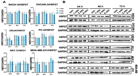 (A): Quantification of HSP27 relative expression level in SKOV-3, OVCAR-3, LNCaP, PC-3, MCF-7, and MDA-MB-231 cells after the exposure to NIPP for 24 h, 48 h, and 72 h. (B): Western blot signals. Each experiment was replicated at least 3 times. Experimental groups were compared to control group. The uncropped bolts are shown in Supplementary Materials.