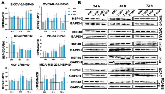 (A): Quantification of HSP40 relative expression level in SKOV-3, OVCAR-3, LNCaP, PC-3, MCF-7, and MDA-MB-231 cells after the exposure to NIPP for 24 h, 48 h, and 72 h. (B): Western blot signals. Each experiment was replicated at least 3 times. Experimental groups were compared to control group. **: p < 0.01, *: p < 0.05. The uncropped bolts are shown in Supplementary Materials.