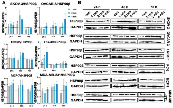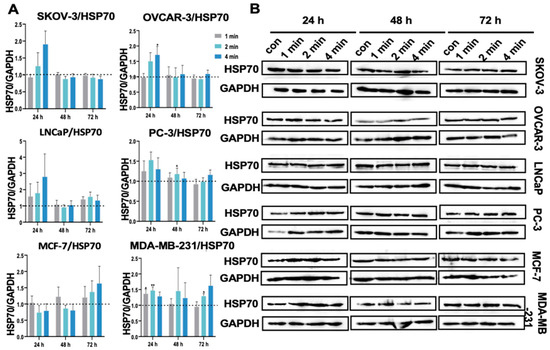 Oxidative stress is known to be one of the factors that increase HSP70 levels [42]. Overexpression of HSP70 can counteract apoptosis caused by oxidative stress and produce cytoprotective effects [42,43]. In our current study, HSP70 protein expression was significantly upregulated only in OVCAR-3 cells in the 4 min group on day 1 after treatment with NIPP (Figure 8). In PC-3 and MDA-MB-231 cells, although some statistically significant changes were observed, the extent of upregulation was not substantial.