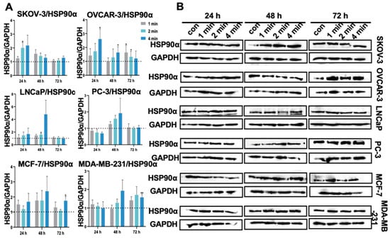 (A): Quantification of HSP90α relative expression level in SKOV-3, OVCAR-3, LNCaP, PC-3, MCF-7 cells, and MDA-MB-231 after the exposure to NIPP for 24 h, 48 h, and 72 h. (B): Western blot signals. Each experiment was replicated at least 3 times. Experimental groups were compared to control group. They were statistically evaluated with Student t-test. **: p < 0.01, *: p < 0.05. The uncropped bolts are shown in Supplementary Materials.