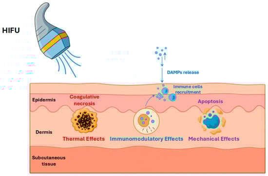 Schematic illustration of HIFU mechanisms of action in dermatology. Thermal coagulative necrosis produced by focused ultrasound (continuous-wave mode), which induces a sharply demarcated zone of tissue ablation at the focal point; acoustic cavitation and mechanical tissue fractionation (histotripsy) from pulsed HIFU, resulting in micro-disruption of cells and extracellular matrix; and HIFU-induced immunomodulation, whereby tumor antigens and DAMPs released from ablated cells trigger an anti-tumor immune response (involving cytokine release and T-cell activation) in the host. These synergistic mechanisms allow HIFU to destroy target lesions while sparing surrounding healthy tissue and potentially engaging systemic anti-cancer immunity.