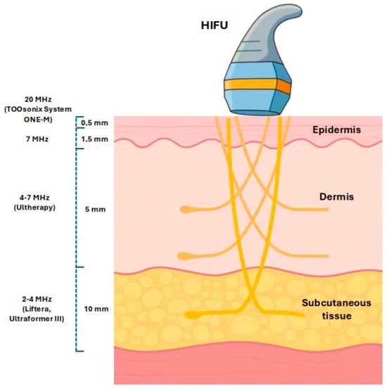 Relationship between ultrasound frequency and depth of penetration for dermatologic HIFU platforms. Higher frequencies (e.g., ~20 MHz) produce very shallow focal zones (approximately 1–3 mm deep) that are appropriate for lesions in the epidermis or superficial dermis, whereas lower frequencies (e.g., 4–7 MHz) can penetrate more deeply (5–13 mm or more) to target subcutaneous structures. Representative commercial devices are operating at the following ranges: Ultraformer III and Liftera (≈2–4 MHz) can reach the subcutaneous fat up to ~10–13 mm for body contouring, Ultherapy (4–7 MHz) treats dermal and SMAS layers at ~3–4.5 mm for facial lifting, and TOOsonix System ONE-M (20 MHz) is designed for superficial lesions in the epidermis and papillary dermis. These device-specific parameters underscore the importance of selecting the appropriate frequency and focal depth based on the lesion’s location and desired treatment outcome.