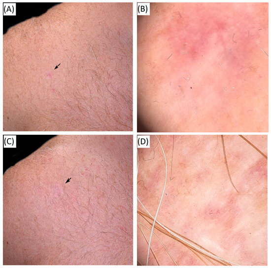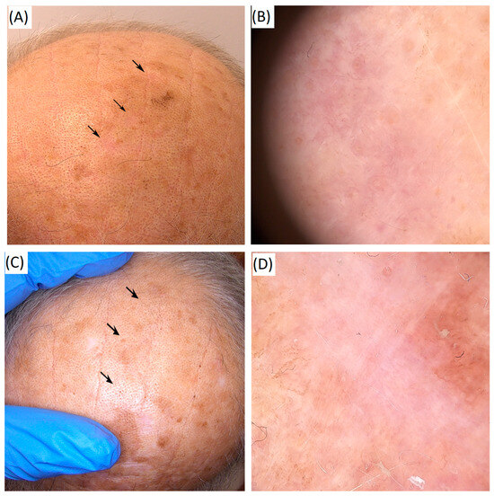 Clinical and dermoscopic images from the author’s collection, published with the patient’s consent. A 68-year-old man is treated with high-intensity focused ultrasound (HIFU) for multiple actinic keratoses and photodamaged scalp skin. (A) Clinical image before treatment. (B) Dermoscopic image before treatment. (C) Clinical image 12 months after a single HIFU session, showing marked improvements in photodamage and lesion clearance. (D) Dermoscopic image 12 months after treatment, demonstrating regression of actinic keratoses and improved skin texture, with residual post-treatment hypopigmentation. The arrows indicate the actinic keratosis (AK) lesions before treatment and after treatment.