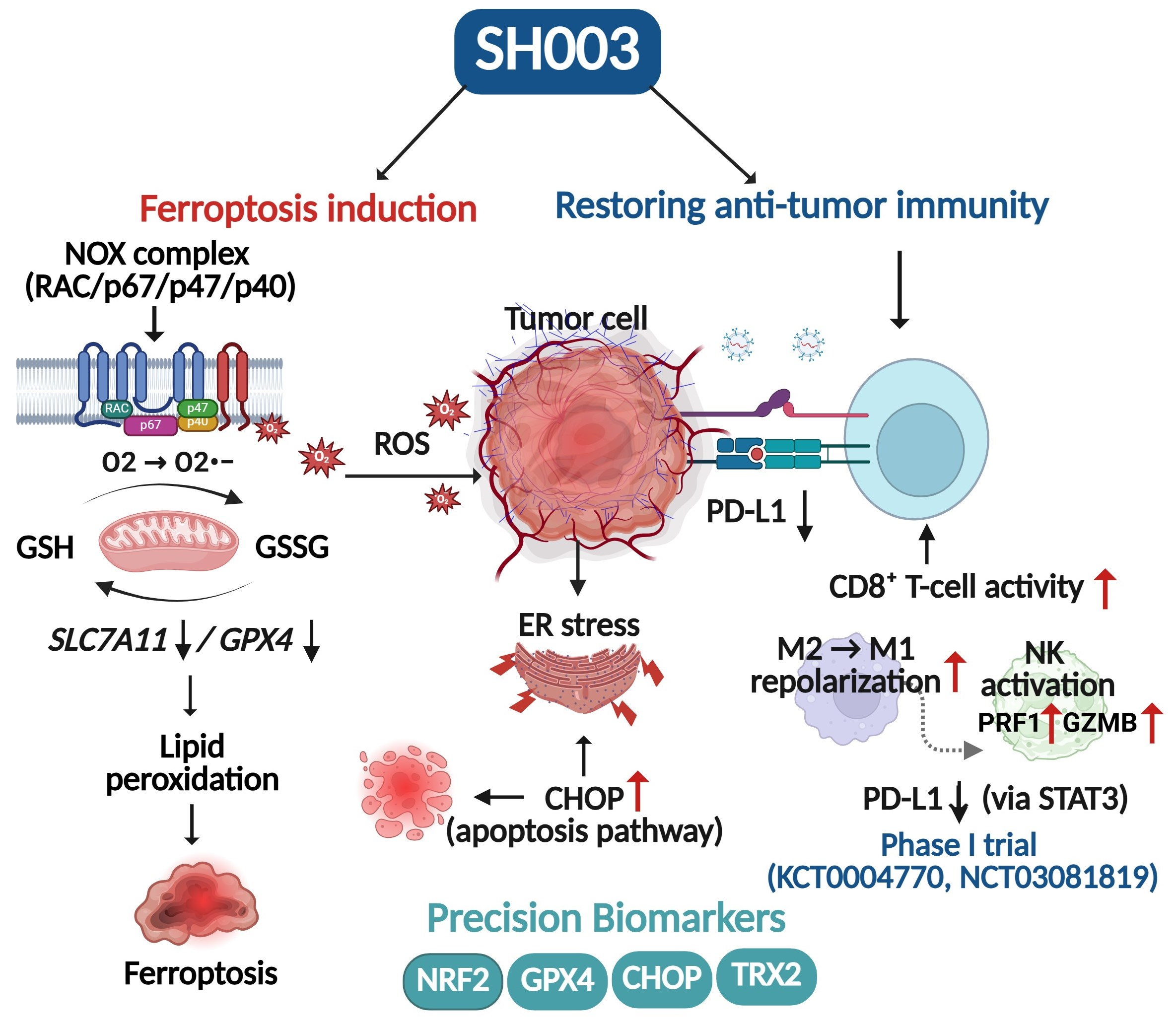 Park, M.N.; Fahim, M.M.H.; Kang, H.N.; Bae, H.; Rani, A.; Nurkolis, F.; Tallei, T.E.; Ko, S.-G.; Kim, B. SH003 as a Redox-Immune Modulating Phytomedicine: A Ferroptosis Induction, Exosomal Crosstalk, and Translational Oncology Perspective. Cancers 2025, 17, 3519. https://doi.org/10.3390/cancers17213519