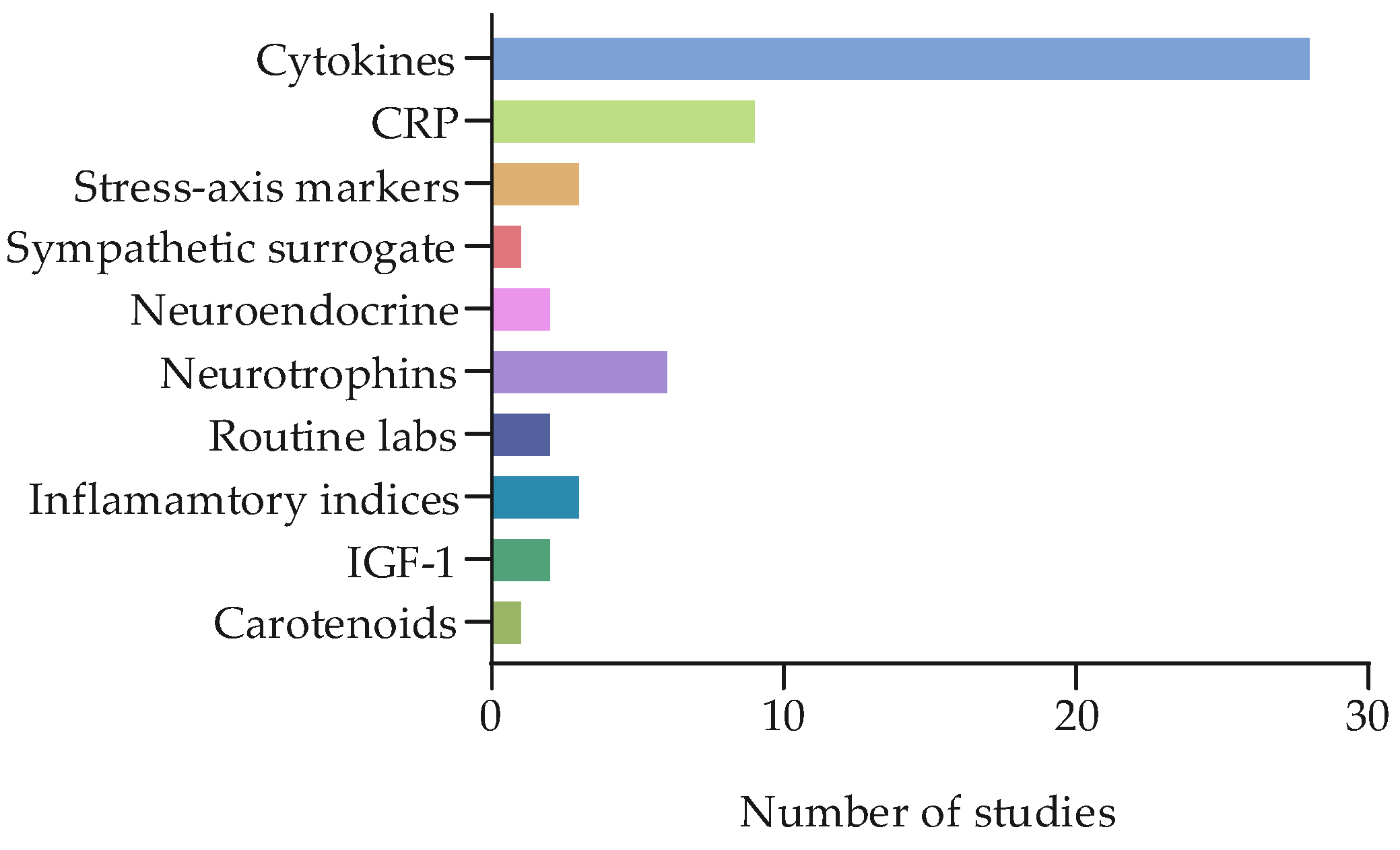 | IL-13 | Limited but somewhat consistent evidence: positive studies reported higher IL-13 associated with poorer cognition. Additional studies found null results. | ~250 (4 studies). | Low ⊕⊕OO (small but directionally consistent evidence of association; downgraded for imprecision but not for inconsistency). |