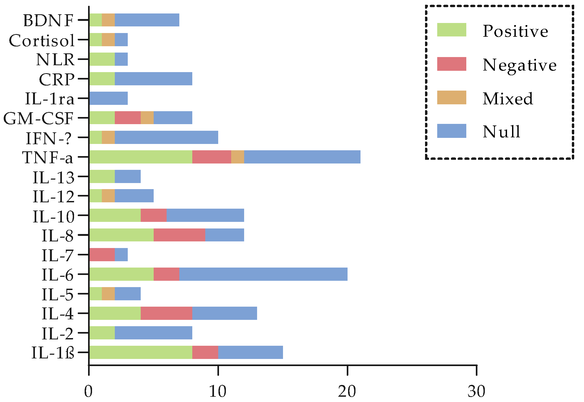| IL-10 | Evidence is inconsistent: direction varies by study (some report worse, others better performance with higher IL-10), and many results are null. | ~1800 (12 studies). | Very low ⊕OOO (serious inconsistency and serious imprecision). |