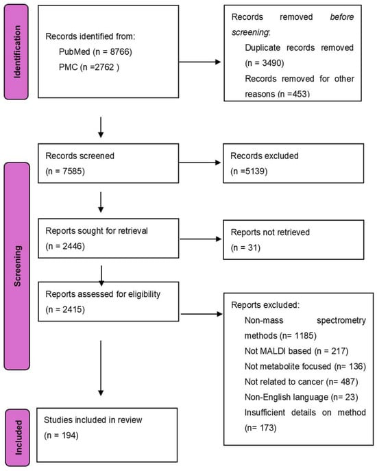 Preferred Reporting Items for Systematic Reviews and Meta-Analyses (PRISMA) flow diagram of the study selection for the review on MALDI-based cancer metabolite detection. Records were identified from PubMed (n = 8766) and PMC (n = 2762). After the removal of duplicates (n = 3490) and irrelevant records (n = 453), 7585 records were screened. Of which, 5139 were excluded at the screening stage, and 31 full-text articles could not be retrieved. Among 2415 articles assessed for eligibility, 2221 reports were excluded due to non-mass spectrometry methods (n = 1185), not MALDI-based (n = 217), not metabolite-focused (n = 136), lack of cancer relevance (n = 487), non-English language (n = 23), or insufficient methodological details (n = 173). A total of 194 studies were included in the final review.