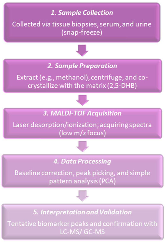 Five-step procedure followed in the MALDI-based detection of cancer metabolites during the year 2000. Early studies had pin-pointed its feasibility but also its limitations, such as sensitivity, mass accuracy, and reproducibility.
