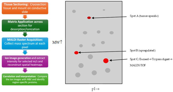 A simplified schematic of 2-D PAGE which involves loading a protein sample into a first-dimension gel to separate proteins by isoelectric point by Le Naour F et al., 2001 [42] that is showing protein separation by the isoelectric point (pI) and the molecular weight (MW). Grey spots are general proteins, while red spots are tumor-enriched proteins that are for excision and MALDI-TOF analysis. The letter A, B, and C are particular spots of three different protein.