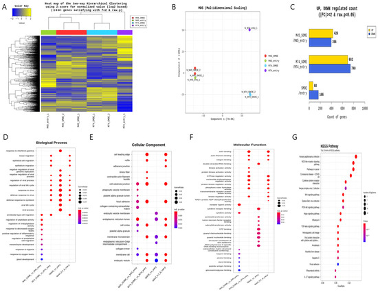 Comparison of the transcriptomes of stable MKN45 and MKN74 cells overexpressing SMARCD3. Heatmap for hierarchical clustering. (A) Multidimensional scaling plot. (B) Number of genes with significantly upregulated or downregulated expression according to fold change and p value. The numbers of genes with upregulated and downregulated expression were compared between the MKN45 and MKN74 cell lines (C). Gene Ontology enrichment (BP, CP and MF) of the top module (D–F) is shown. KEGG pathway enrichment of the top module (G).