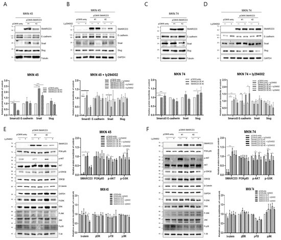 Given that SMARCD3 has been implicated in the regulation of epithelial–mesenchymal transition (EMT), we next sought to investigate the signaling pathways potentially involved in this process. The PI3K/AKT pathway has been widely reported to promote EMT through downstream effectors such as GSK-3β (ser9) and β-catenin, which regulate transcriptional repressors, including Snail and Slug. In addition, signaling cascades within the MAPK family, including the ERK, p38, and JNK pathways, play crucial roles in modulating cellular proliferation, survival, and invasion during cancer progression. To clarify whether SMARCD3 exerts its EMT-promoting effects through these signaling networks, we examined the expression and phosphorylation status of key molecules—PI3K p85, AKT (Ser473), GSK-3β (Ser9), β-catenin, ERK, p38, and JNK—by Western blotting. In MKN45 cells treated with LY294002, a significant decrease in the expression of these proteins was observed in the control group, with * p = 0.0314, while SMARCD3 overexpression group #1 also exhibited a significant reduction in protein expression, with * p = 0.02. Furthermore, phosphorylation of p-GSK3β at Ser9 was significantly lower in SMARCD3-overexpressing group #1 than in the control group, with * p = 0.015; in group #2, phosphorylation levels also significantly decreased (**** p < 0.0001). Additionally, the phosphorylation levels of β-catenin and PERK were lower in the LY294002-treated groups than in the untreated control group (Figure 2E and Figure S6). In MKN74 cells treated with LY294002, the phosphorylation levels of AKT in the control group significantly decreased, with * p = 0.0135. The SMARCD3 overexpression groups demonstrated further significant decreases in phosphorylation levels, with group #1 showing ** p = 0.0019 and group #2 showing * p = 0.0144. With respect to the phosphorylation of p-GSK3β at Ser9, the control group exhibited a significant decrease, with * p = 0.007. Even more pronounced decreases were detected in the SMARCD3-overexpressing groups, with group #1 having **** p < 0.0001 and group #2 showing * p = 0.024. Additionally, the phosphorylation levels of β-catenin, PERK, p-p38, and p-JNK were lower in the LY294002-treated groups than in the untreated control group (Figure 2F and Figure S7). These results suggest that SMARCD3 overexpression suppresses the nuclear accumulation of key EMT-related transcription factors and signaling proteins under PI3K inhibition.