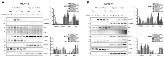 Nuclear and cytosolic fractionation of EMT-related proteins in MKN45 (A) and MKN74 (B) cells treated with LY294002. Western blot analysis revealed changes in the expression and subcellular localization of SMARCD3, E-cadherin, Snail, Slug, β-catenin, c-Myc, and Cyclin D in nuclear and cytosolic fractions with and without LY294002 treatment. The data are presented as the means ± SDs for three independent experiments, and the error bars indicate the SDs. Statistical analysis was performed by two-way ANOVA. * p < 0.05, ** p < 0.01, *** p < 0.001 **** p < 0.0001. The original Western blot figures are shown in Figures S8 and S9.