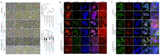 To evaluate the role of SMARCD3 in epithelial–mesenchymal transition (EMT), cell number and size were quantified using optical microscopy in three randomized areas of equal unit area per sample. SMARCD3 overexpression significantly increased cell numbers compared with those in the control group (control vs. SMARCD3 overexpression group #1: ** p = 0.0035; group #2: * p = 0.015). The count of the control cells was 28.67 ± 6.03 cells (mean ± standard deviation), which increased marginally to 35.33 ± 5.13 cells upon LY294002 treatment (p = 0.29). The number of SMARCD3-overexpressing cells decreased (13 ± 2.65 in group #1; 16 ± 1 in group #2), but it increased after LY294002 treatment, though this increase did not reach statistical significance (20.67 ± 1.53, p = 0.19 in group #1; 25.33 ± 5.86, p = 0.08 in group #2). The cell area was significantly larger in the SMARCD3-overexpressing groups than in the control group (**** p < 0.0001). LY294002 treatment significantly reduced the cell area both in the control group (from 1184 ± 412.6 to 1024 ± 338.7, p = 0.0048) and in the SMARCD3-overexpression groups (from 2442 ± 799.2 to 1392 ± 383.8, ** p < 0.0001 in group #1; from 1928 ± 562.5 to 1274 ± 563, p < 0.05 in group #2) (Figure 4A). Furthermore, fluorescence microscopy revealed that compared with the control, SMARCD3 overexpression disrupted morphology related to the EMT marker E-cadherin, resulting in less compact and irregular patterns in groups #1 and #2. LY294002 treatment restored the continuity and localization of E-cadherin, restoring it to an intact morphology (Figure 4B). Next-generation sequencing (NGS) analysis demonstrated the activation of the WNT and PI3K-AKT signaling pathways upon SMARCD3 overexpression. To investigate the associated cellular changes, the colocalization of β-catenin and Snail was examined. Compared with control cells, SMARCD3-overexpressing cells (groups #1 and #2) presented increased nuclear localization of Snail, which was reduced following LY294002 treatment, whereas the changes in β-catenin localization were less pronounced. (Figure 4C). Taken together, these findings support a regulatory role for SMARCD3 in modulating EMT through the PI3K-AKT and WNT/β-catenin signaling pathways in gastric cancer cells.