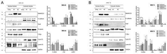 To confirm the activation of the WNT pathway and the association between SMARCD3 and epithelial–mesenchymal transition (EMT), WNT signaling was stimulated using WNT3A. Following overexpression of smarcd3 in MKN45 and MKN74 cells, TCF/LEF reporter analysis was performed 4 h after WNT3A treatment. This confirmed that smarcd3 alone also increased β-catenin activity in smarcd3-overexpressing cells (S10). To validate β-catenin and EMT activation in smarcd3-overexpressing cells, cells were fractionated into nuclear and cytoplasmic fractions after WNT3A treatment (final concentration 50 ng/mL, harvested exactly 4 h prior). Changes in the expression of EMT-related proteins β-catenin, c-Myc, and Cyclin D were investigated. In MKN45 cells, nuclear Snail protein expression was significantly higher in the SMARCD3-overexpressing group #1 compared to the control group (Figure 5A and Figure S11; **** p < 0.0001). Similarly, MKN74 cells in SMARCD3 overexpression groups #1 and #2 exhibited significantly increased nuclear Snail levels compared to control cells (Figure 5B and Figure S12; ** p = 0.001 and ** p = 0.002). These results suggest that SMARCD3 may promote the β-catenin–TCF/LEF complex, but whether it acts directly as a coactivator for transcription factors requires additional data, such as luciferase assays, under conditions of reduced β-catenin (KD/KO).