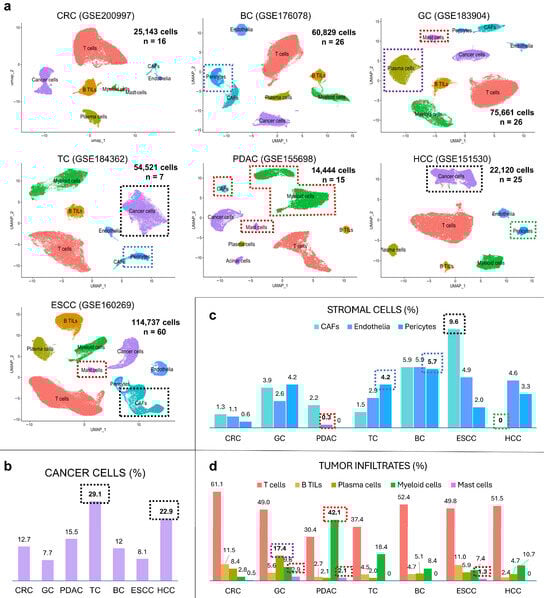 Immune infiltrates included T cells, B TILs, plasma cells, myeloid cells, and mast cells (Figure 1d). T cells were the most abundant in CRC (61.1%) and BC (52.4%), but lower in PDAC (30.4%), suggesting immune suppression. PDAC also showed the highest proportion of myeloid cells (Figure 1d, red frame). GC uniquely showed plasma cell enrichment (Figure 1d, purple frame), reflecting diffuse type histology []. Mast cells appeared in PDAC, ESCC, and GC, but scarce in BC, TC, and HCC (Figure 1d, red-brown frames).