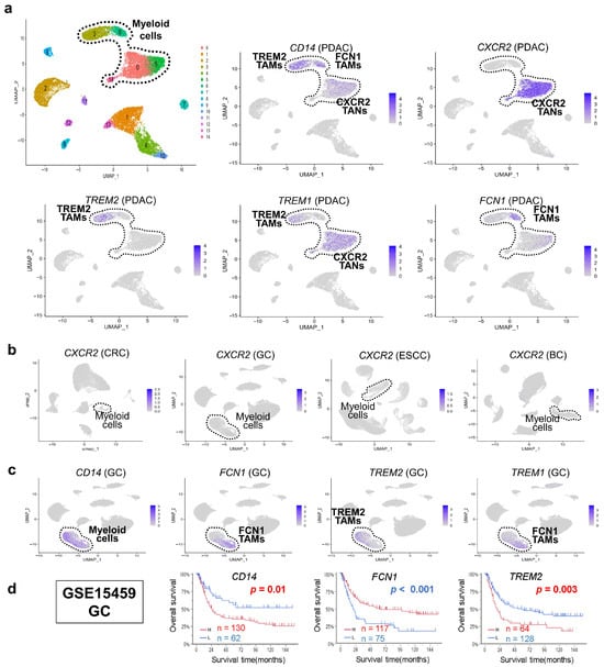 Identification of CXCR2-positive myeloid subsets unique to PDAC. (a) Clustering of myeloid cells in PDAC scRNA-seq data identified CD14-positive populations localized to clusters 0, 3, 5, 6, and 14. These were subclassified into TREM2 and FCN1 TAMs. Clusters 0, 5, and 14 co-expressed CXCR2 and were reclassified as CXCR2-positive TANs (CXCR2 TANs). (b) Comparative analysis of CXCR2+ myeloid cells across cancers revealed a PDAC-specific enrichment. (c) In GC, CXCR2 TANs were absent, and TREM1 was confined to FCN1 TAMs. PDAC uniquely showed overlapping TREM1 and TREM2 expression in FCN1 TAMs. (d) Kaplan–Meier survival curves in GC (GSE15459) indicated that high expression of CD14, FCN1, and TREM2 was associated with poor prognosis.