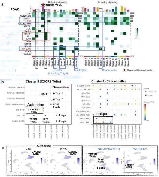 We analyzed intercellular signaling in PDAC using CellChat []. TREM2 TAMs (cluster 3) were the most dominant senders, whereas CXCR2 TANs (clusters 0 and 5) exhibited minimal sender activity according to CellChat probability scores (Figure 3a, dotted frames), likely due to the absence of key signaling pathways such as MIF, SPP1, and CXCL, which were predominantly active in TREM2 TAMs. Despite such low activity, CXCR2 TANs uniquely showed outgoing signals via BAFF, IL1, IL16, and TGFB pathways (Figure 3a, red frame), forming paracrine networks with T and B cells via BAFF (TNFSF13B), IL16, and TGFB1 (Figure 3b, left panel). They also exhibited autocrine IL1B–IL1R2 signaling (Figure 3b,c), but lacked interactions with cancer cells (cluster 2) (Figure 3a, red frame). TGFB1 receptors were expressed in IFNG-positive T cells (cluster 10).