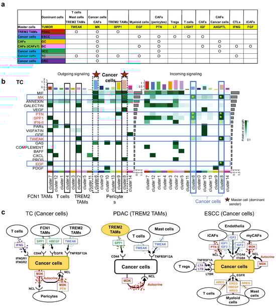 Divergent master cell populations and tumor-directed signaling across cancers. (a) Summary of dominant sender (“master”) clusters and signaling pathways in seven cancers. TREM2 TAMs were dominant in PDAC; CAFs in GC and BC; and tumor cells in ESCC, HCC, TC, and CRC. (b) Outgoing signaling heatmap in TC shows multiple tumor clusters (e.g., clusters 6 and 8) as active senders. (c) Diagrams of key ligand–receptor signaling toward tumor cells in TC, PDAC, and ESCC, including MDK, PTN, SPP1, TWEAK, EGF, and IFNG. Shared pathways had distinct cellular sources across tumor types.