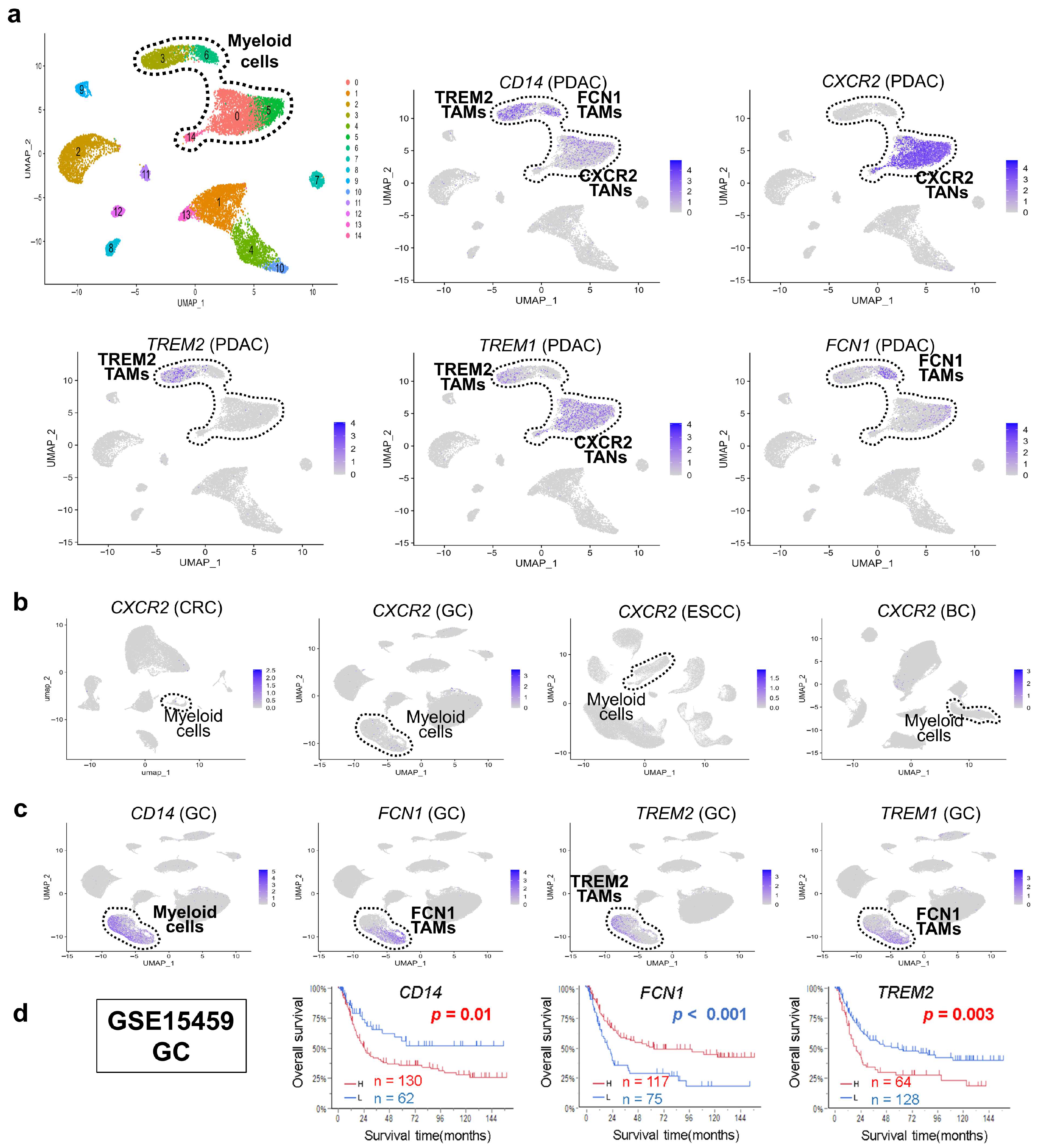 - Cao, Q.; Sun, D.; Tu, C.; Wang, J.; Fu, R.; Gong, R.; Xiao, Y.; Liu, Q.; Li, X. Defining gastric cancer ecology: The crucial roles of TREM2(+) macrophages and fibroblasts in tumor microenvironments. Commun. Biol. 2025, 8, 514. [Google Scholar] [CrossRef] [PubMed]