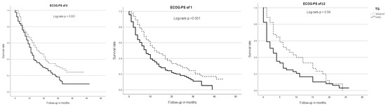 Regarding ECOG subgroups, patients with an ECOG-PS of ≥2 (mOS = 4 m; 95% CI 2.43–5.57) had a significantly shorter survival time than patients with an ECOG-PS of 0 (mOS = 13 m; 95% CI 11.3–14.7) or 1 (mOS = 10 m; 95% CI 8.34–11.66, p < 0.001). In all ECOG subgroups, patients of the early TG had a significantly shorter mOS than patients of the delayed TG—ECOG 0: 11 m (95% CI 9.52–11.48) vs. 16 m (95% CI 12.17–19.83; p = 0.001), ECOG 1: 8 m (95% CI 6.17–9.83) vs. 12 m (95% CI 7.79–16.21; p < 0.001) and ECOG ≥2: 3 m (95% CI 1.26–4.74) vs. 7 m (95% CI 2.58–11.43; p = 0.04) (Figure 2).