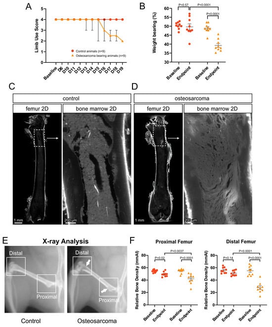 The experimental endpoint (limb use score of 2) was reached as early as Day 13 in some osteosarcoma-injected animals (Figure 1A). There was a clear reduction in limb use in the majority of osteosarcoma animals from Days 16–19 (Figure 1A). In contrast, there was no change in limb use at any timepoint in control animals (Figure 1A). All osteosarcoma-injected animals had decreased weight bearing at the experimental endpoint (Figure 1B). Two-way ANOVA revealed a significant interaction effect for weight bearing (F [1, 16] = 22.37, p = 0.0002). Weight bearing at the experimental endpoint was significantly reduced in osteosarcoma-injected relative to control animals (Fishers LSD, p < 0.0001, Figure 1B). It was also significantly reduced relative to baseline in osteosarcoma-injected (Fishers LSD, p < 0.0001, Figure 1B), but not in control, animals (Fishers LSD, p = 0.5748, Figure 1B). At the experimental endpoint, control animals had a well-organized, normal femoral marrow cavity appearance (Figure 1C). In contrast, the entire femoral marrow cavity of osteosarcoma-injected animals was less organized and devoid of normal morphology, consistent with tumor growth through the whole bone (Figure 1D). X-ray analysis revealed a reduction in bone density in osteosarcoma-injected compared to control animals (Figure 1E,F). Two-way ANOVA revealed a significant interaction effect for relative bone density both in the proximal (F [1, 16] = 7.792, p = 0.0131) and distal (F [1, 16] = 20.94, p = 0.0003) femur. At the experimental endpoint, there was a significant reduction in relative bone density in the proximal (Fishers LSD, p = 0.0044, Figure 1F) and distal (Fishers LSD, p < 0.0001, Figure 1F) femur of osteosarcoma-injected compared to control animals. Relative bone density at the experimental endpoint was also significantly reduced compared to baseline in both the proximal (Fishers LSD, p < 0.0001, Figure 1F) and distal (Fishers LSD, p < 0.0001, Figure 1F) femur of osteosarcoma-injected animals.