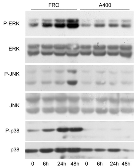 The activation of stress kinases is attenuated in A400 cells. Cells were plated in 60 mm diameter plates to about 50% confluence in DMEM high-glucose 10% FBS with Tn (A400 cells) or vehicle (FRO cells). After 24 h, Tn and vehicle (in A400 and FRO cells, respectively) were removed from the culture medium for 48 h. Then, 800 ng/mL Tn was added for various times to both cell lines. Western blots of total protein extracts from FRO and A400 cells were carried out as indicated in the Materials and Methods section. Uncropped Western blot images are shown in Supplementary Material Figure S6, and the densitometric analysis results are shown in Supplementary Material Figure S7.