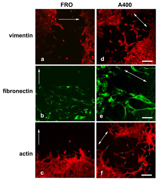 A400 cells, caught in the act of moving, are heavily stained with VIM and FN and show lamellypodia at the leading edge. Cells were plated on glass coverslips and grown to sub-confluence in DMEM high-glucose 10% FBS with Tn (A400 cells) or vehicle (FRO cells). Then, cells were incubated in DMEM without FBS, Tn, or vehicle for 48 h. The cell monolayers were scratched with a sterile 200 μL pipette tip to create a wound, washed twice with serum-free DMEM, and then placed in medium without FBS, Tn, or vehicle. After 14–16 h, cells were processed for immunofluorescence, as indicated in the Materials and Methods section. Panels (a–c): FRO cells immunostained with VIM, FN, and actin, respectively. Panels (d–f): A400 cells stained with VIM, FN, and actin, respectively. The big arrows indicate the direction of the movement; i.e., they are perpendicular to the major axis of the wound. The small arrows in panel (f) indicate lamellipodia at the leading edge of A400 cells. Scale bars: (d) 50 μm; (e) 10 μm; (f) 20 μm.